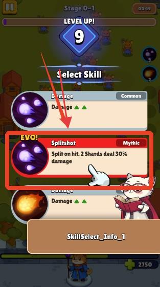 1、“技能選擇”,角色升級(LEVELUP)時,挑選技能(Splitshot),強(qiáng)化戰(zhàn)斗能力,適配關(guān)卡(Stage0-1)。