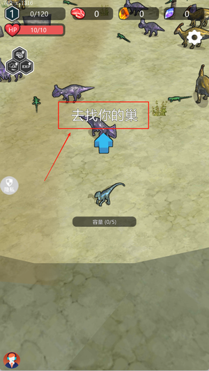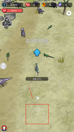 2、界面下側(cè)為移動(dòng)控制區(qū)域,可操控恐龍自由移動(dòng);上側(cè)顯示各類(lèi)資源,以及當(dāng)前恐龍的血量與能量狀態(tài),便于實(shí)時(shí)掌握戰(zhàn)斗情況。