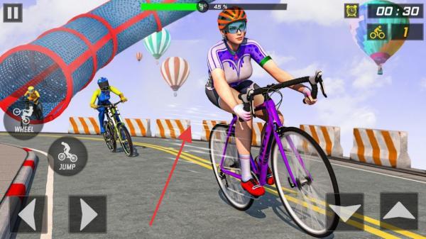 1、騎行時(shí),遇到高空坡道,提前點(diǎn)擊左側(cè)【JUMP】鍵,讓角色騰空越過,注意把握時(shí)機(jī),借助熱氣球場景完成跳躍。
