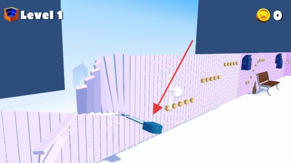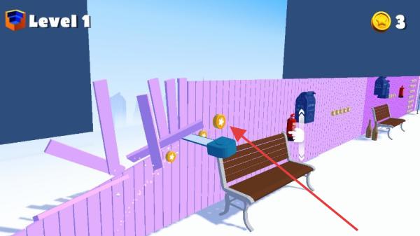1、操控藍色工具破壞紫色圍欄,沿路徑收集金幣,注意避開障礙,推進關卡。