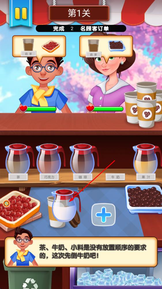 1、剛開(kāi)啟奶茶店生涯,先熟悉各種原料的特性,面對(duì)第一位顧客的訂單,仔細(xì)挑選原料,按步驟一步步調(diào)制出符合要求的奶茶。