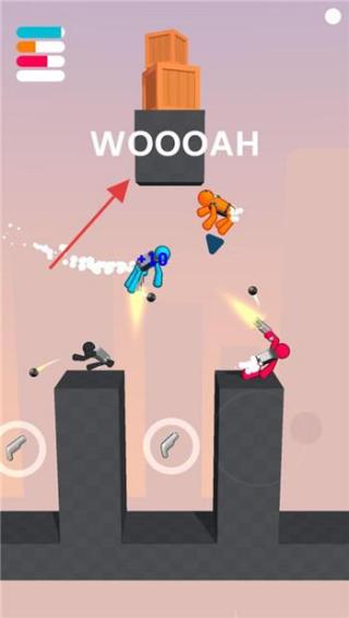 2、戰(zhàn)斗推進(jìn):讓火柴人在關(guān)卡(如高臺(tái)、凹槽地形)中,借碰撞、掉落,擊敗敵方火柴人。