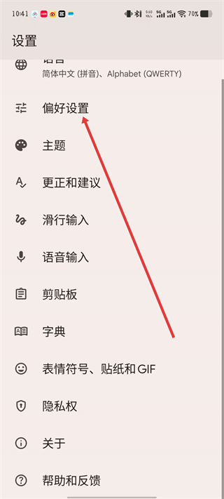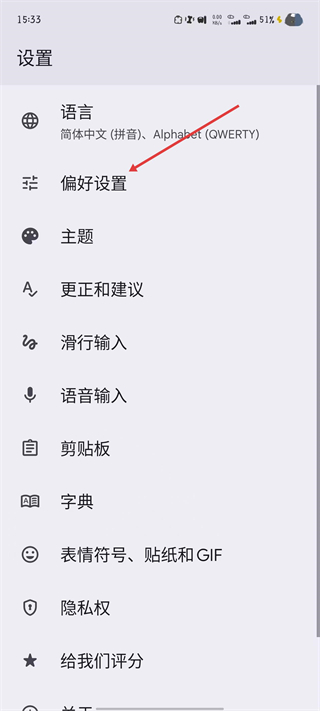 1、打開谷歌鍵盤輸入法的設(shè)置頁面,點擊偏好設(shè)置選項。