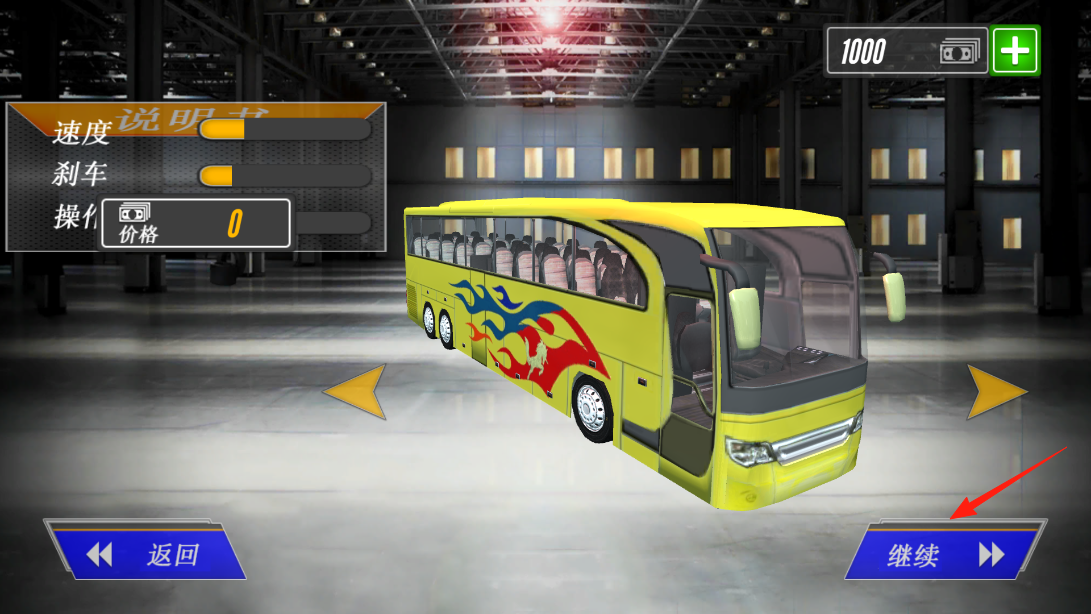 2、在巴士改裝界面,可查看車輛屬性(速度、剎車),點擊“繼續(xù)”,完成車輛準備,借改裝確認機制,進入正式運輸環(huán)節(jié),體驗車輛狀態(tài)對駕駛的影響,感受模擬運營的細節(jié)。