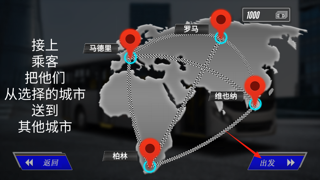 3、在城市地圖界面,依據(jù)提示“接上乘客,送往其他城市”,點擊“出發(fā)”,選定運輸路線,借城市聯(lián)運機制,駕駛巴士穿梭于不同城市間,完成乘客接送,體驗長途運輸?shù)牟呗酝娣ā?