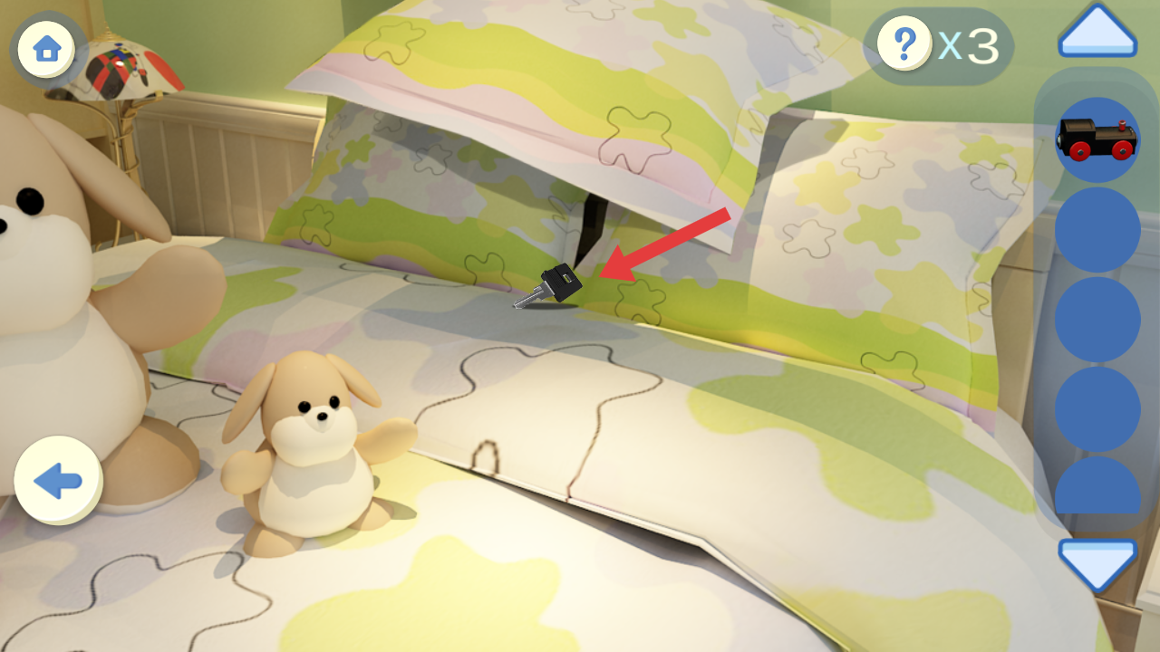 1、進入游戲后,需要點擊枕頭下方露出的黑色鑰匙,收集該道具,為后續(xù)場景解謎儲備關(guān)鍵物品。
