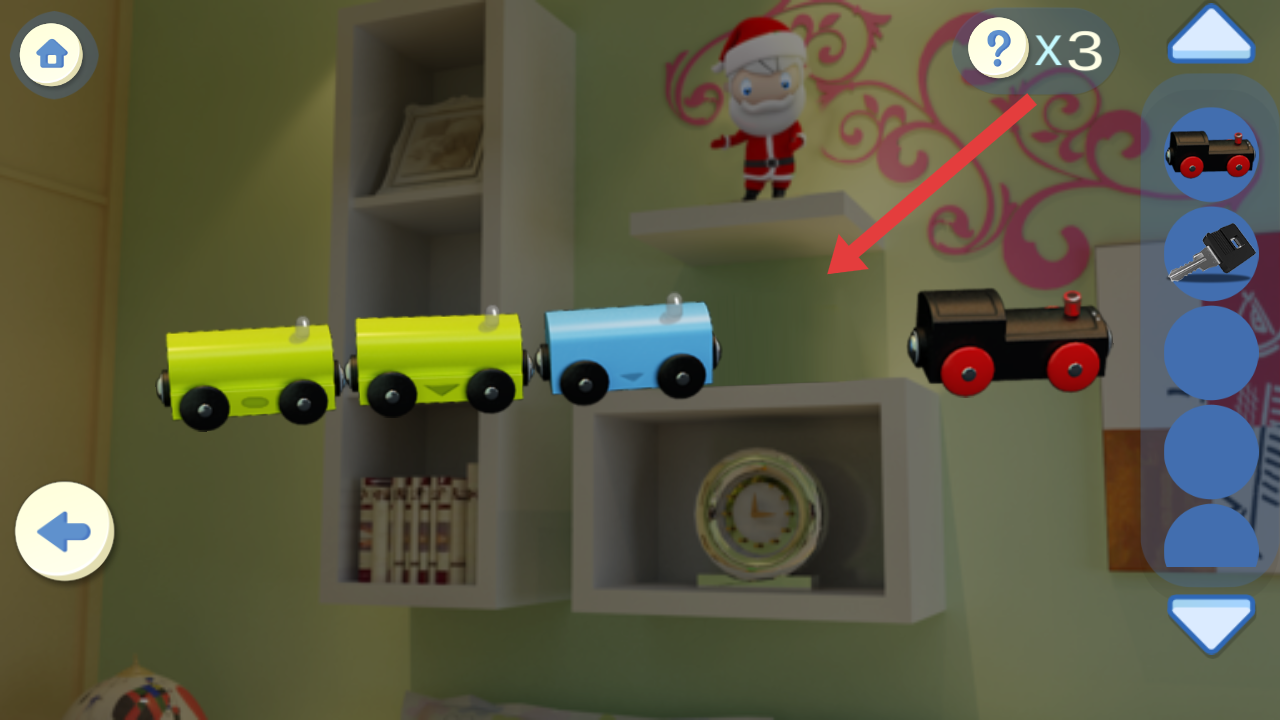 3、將收集的黃色小車與黑色火車頭、藍色小車拼接,按順序組裝成完整火車,觸發(fā)場景互動解鎖新線索。