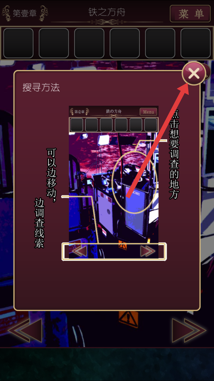 2、點(diǎn)擊教程彈窗右上角的紅色【×】關(guān)閉指引,依據(jù)“點(diǎn)擊想要調(diào)查的地方”提示,操控場(chǎng)景移動(dòng),對(duì)車(chē)內(nèi)設(shè)備開(kāi)展線索搜查。