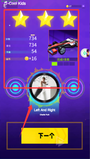 1、進(jìn)入游戲后先選擇單人挑戰(zhàn)模式,熟悉基礎(chǔ)操作與音樂(lè)節(jié)奏的配合,通過(guò)點(diǎn)擊屏幕控制賽車(chē)左右移動(dòng)避開(kāi)障礙物。