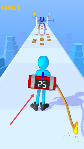 1、進(jìn)入標(biāo)注“LEVEL1”的關(guān)卡,操控背有時限炸彈的藍(lán)色小人,開啟跑道冒險。