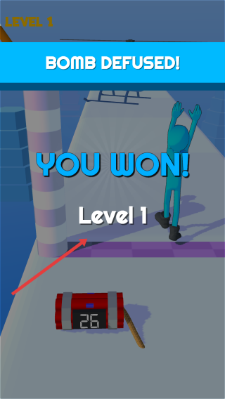 3、成功抵達(dá)跑道終點區(qū)域,觸發(fā)“BOMB DEFUSED”拆彈判定,屏幕顯示“YOU WON”,即完成Level1,可解鎖后續(xù)關(guān)卡。