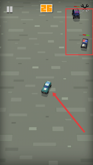 2、游戲中,操控藍(lán)色車輛,躲避紅色方框內(nèi)的警車追捕,利用走位,在灰色路面上持續(xù)行駛,積累分?jǐn)?shù)。
