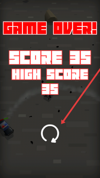 3、若被警車追上(GAME-OVER),顯示得分“35”,點(diǎn)擊重玩按鈕,重新開始,調(diào)整策略,爭(zhēng)取更高分?jǐn)?shù)。