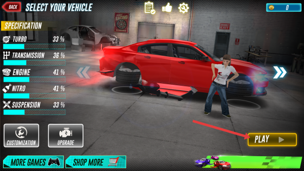 1、車庫選紅色賽車,查看“TURBO”(渦輪)、“ENGINE”(引擎)等性能,點(diǎn)“PLAY”進(jìn)入模式選擇。