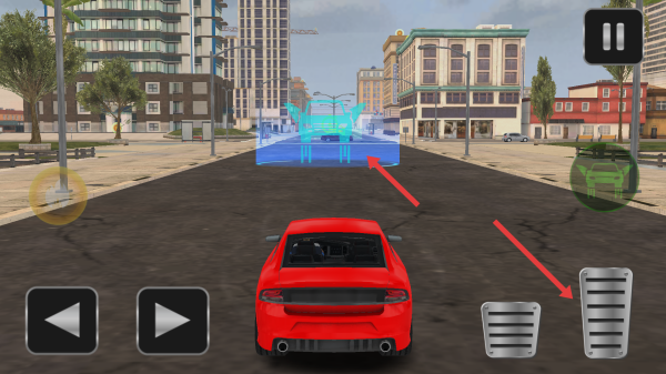 3、通過虛擬按鍵(方向、油門)駕駛,利用飛行功能(如變身飛行汽車穿越藍(lán)色光圈),完成競(jìng)速、特技任務(wù),可升級(jí)車輛性能。