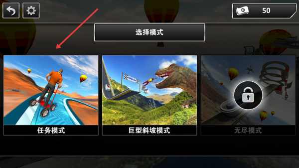 1、主界面選【任務(wù)模式】,進(jìn)入含熱氣球、沙漠景觀的賽道,開啟特技駕駛挑戰(zhàn)。