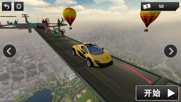 2、在高空賽道界面,點(diǎn)擊【開始】,駕駛黃色跑車,準(zhǔn)備挑戰(zhàn)空中特技軌道。