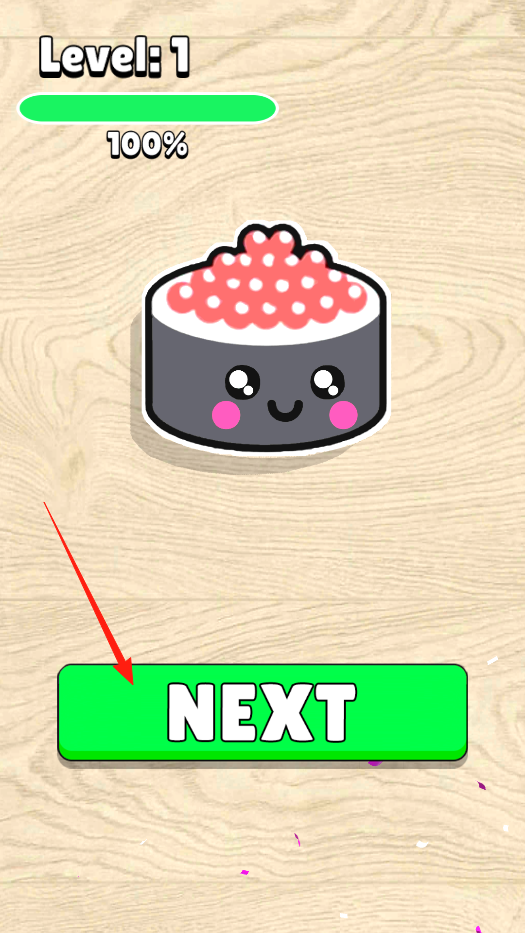 3、成功拼好壽司,進(jìn)度條100%,出現(xiàn)NEXT按鈕,點(diǎn)擊進(jìn)入下一關(guān),嘗試?yán)^續(xù)用拖動、拼裝的方式,讓零散部件變成完整可愛的東西,感受創(chuàng)意拼圖的無限趣味。