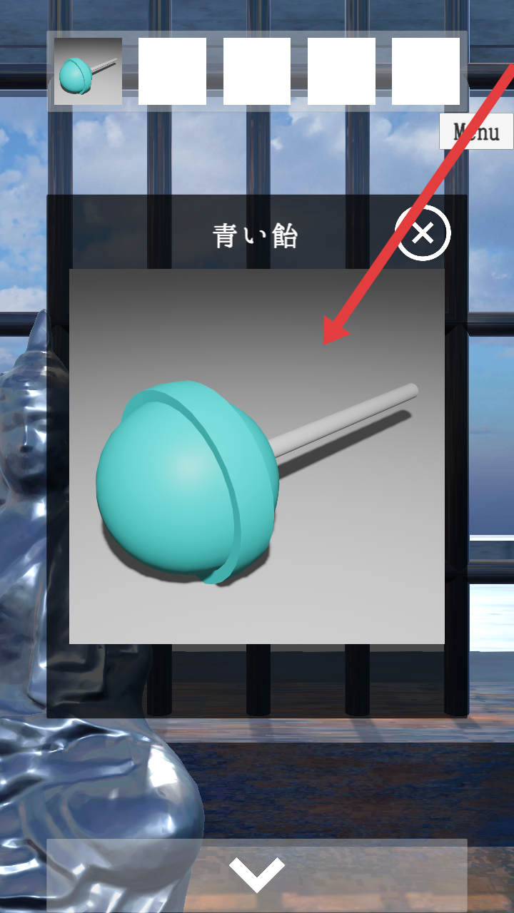 3、拾取藏在銀色佛像身后標(biāo)注青い飴藍(lán)色糖果的道具,需要點擊收集該道具到我們的道具欄中。
