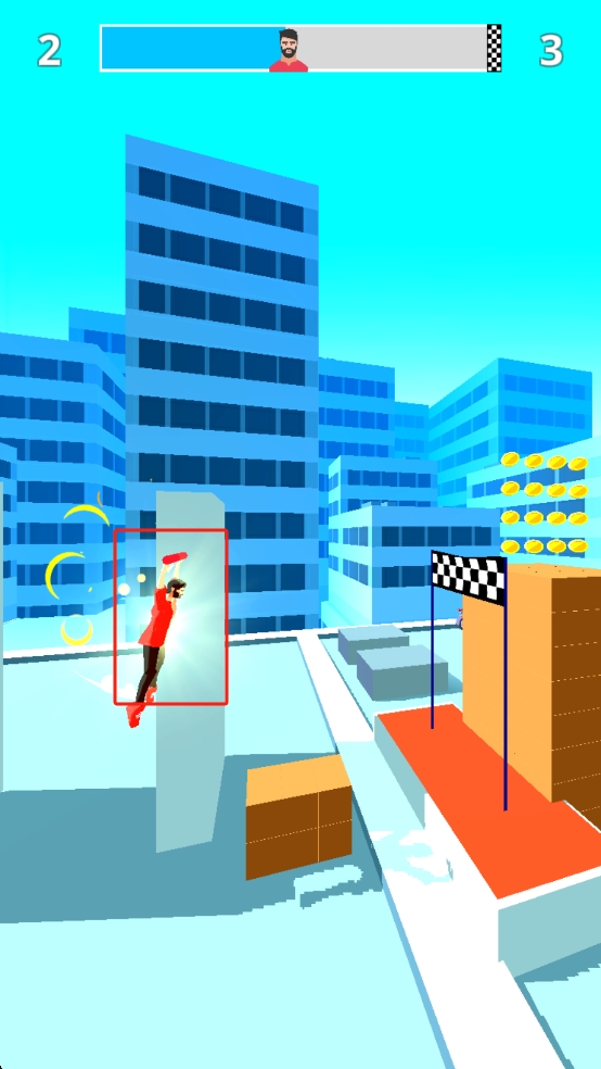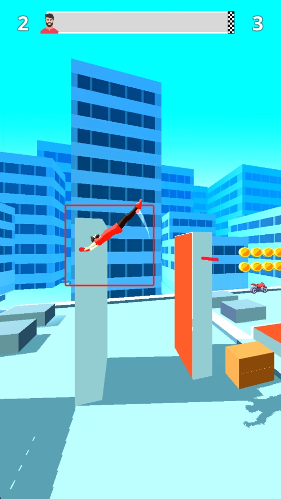 1、操控角色在城市屋頂跑酷,遇灰色高臺(tái)時(shí),把握時(shí)機(jī)觸發(fā)翻轉(zhuǎn)動(dòng)作,借助慣性翻越,保持跑酷節(jié)奏往前推進(jìn)。