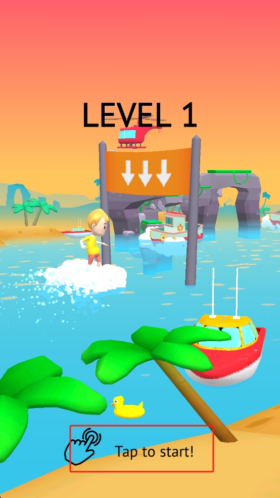 1、點(diǎn)擊屏幕下方的區(qū)域開始游戲,操控角色站在水上浮塊,規(guī)劃跳躍路徑,利用浮塊移動(dòng),避開水中危險(xiǎn),往目標(biāo)前進(jìn)。