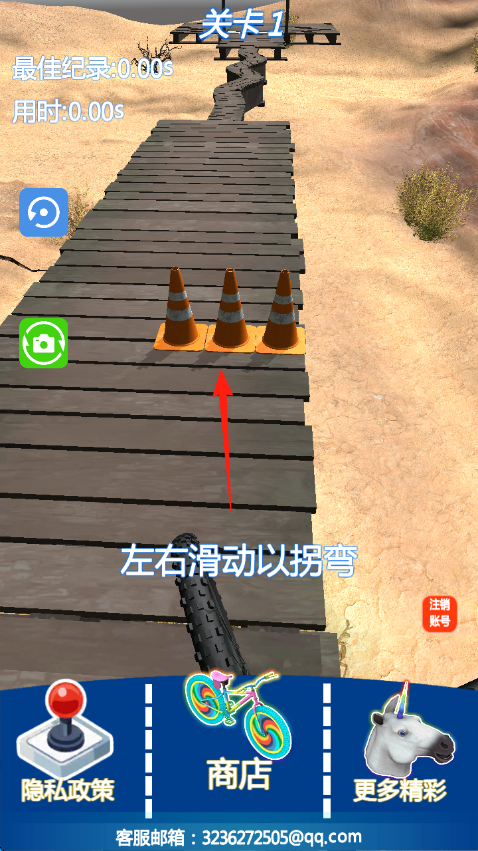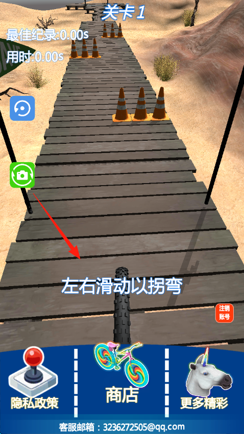 1、關(guān)卡1開始,按左右滑動以拐彎提示,練習滑動屏幕控制自行車轉(zhuǎn)向,適應(yīng)操作。