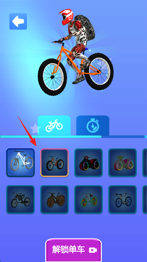 3、進入車輛界面,點擊箭頭指向的自行車,用金幣或觀看廣告解鎖,更換車輛提升性能。