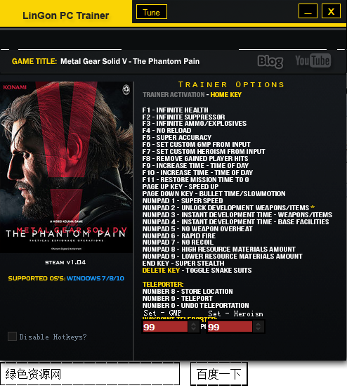 合金裝備5:幻痛修改器是專門為合金裝備玩家制作的游戲修改工具,具有無限生命,無限消聲器等多種游戲功能,讓你在游戲中無所不能,有需要的 玩家趕緊下載吧!