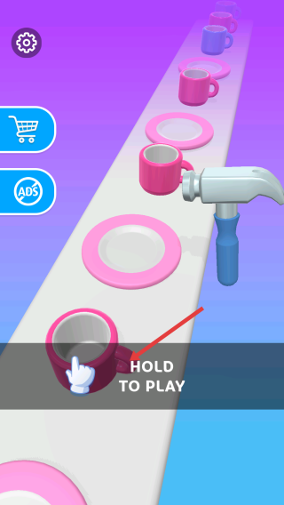1、游戲開局,看到HOLD TO PLAY提示,長按屏幕控制錘子,對準(zhǔn)軌道上的杯子,準(zhǔn)備敲擊。