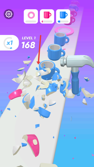 2、進(jìn)入LEVEL1,在軌道滑行中,看準(zhǔn)藍(lán)色杯子位置,用錘子精準(zhǔn)擊碎,注意避開其他顏色器具。