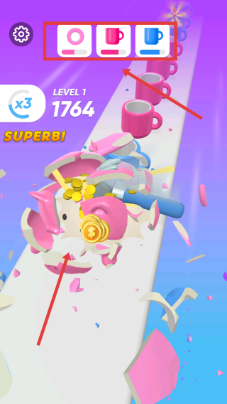 3、持續(xù)擊碎對應(yīng)上方圖標(biāo)顏色的杯子粉盤、粉杯、藍(lán)杯,收集金幣,達(dá)成SUPERB評價,推進(jìn)關(guān)卡。