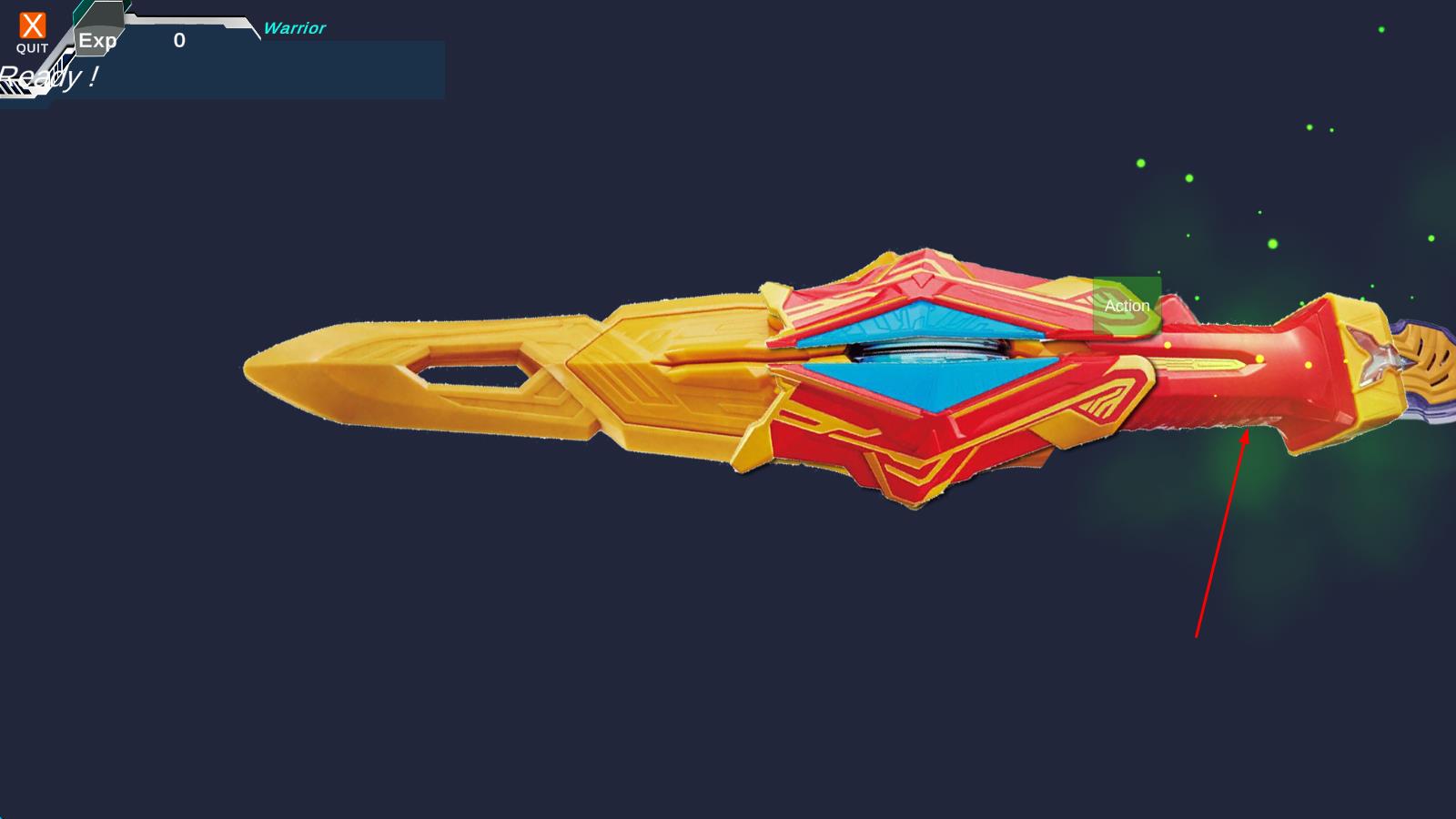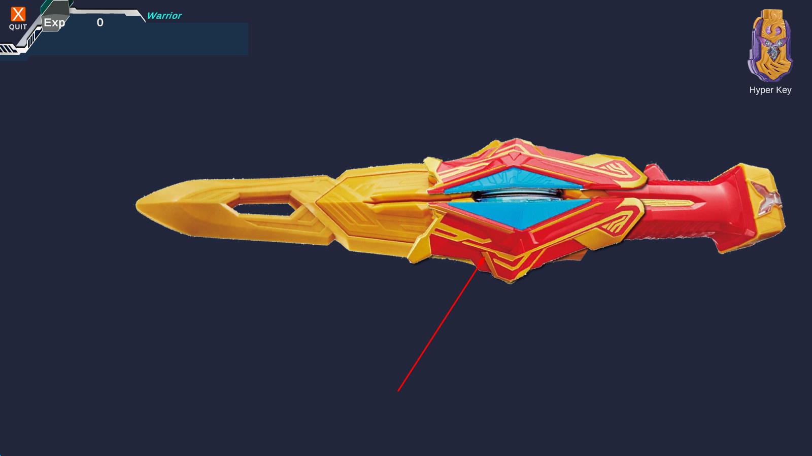 1、打開游戲,屏幕中央橫放著處于特利迦模式劍格收束的奧特二重劍,插入奧特次元密鑰,點擊右側(cè)按鈕啟動武器。