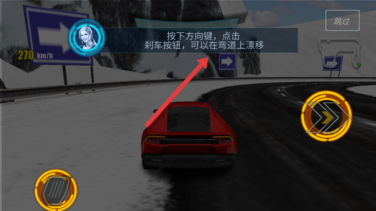 3、進(jìn)入賽車(chē)彎道時(shí),同時(shí)按住方向鍵與左下角剎車(chē)按鈕,觸發(fā)漂移,維持車(chē)速與軌跡穩(wěn)定。
