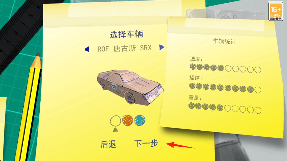 1、打開游戲,在車輛選擇界面,選定造型獨特的ROF唐古斯SRX紙盒車,確認其速度、操控、重量等屬性適配玩法后,點擊下一步。