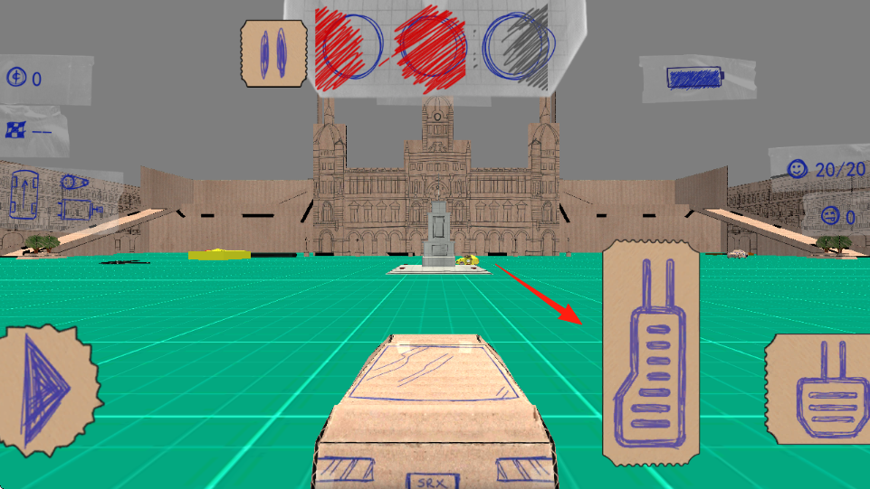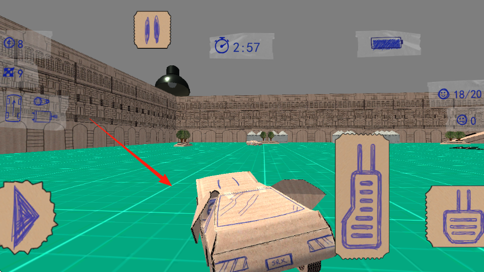 2、在手繪風格場景,點擊右側遙控器按鈕箭頭指向,嘗試操控車輛移動、轉向。