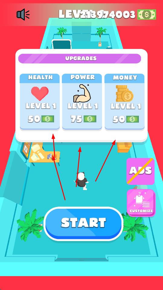 1、進(jìn)入游戲前,可花費(fèi)對(duì)應(yīng)金幣提升角色的HEALTH、POWER、MONEY等級(jí),為游戲通關(guān)助力。