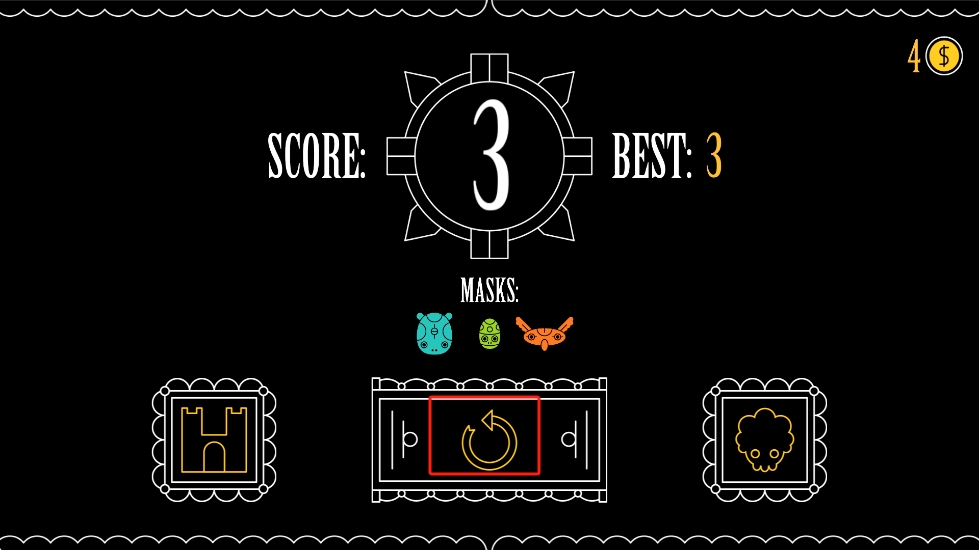 3、結(jié)算后若想挑戰(zhàn)更高分數(shù),點擊中間循環(huán)箭頭按鈕,重新開始游戲,嘗試收集更多面具角色。