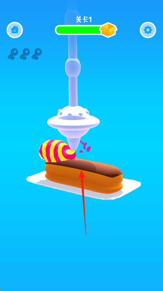 1、進(jìn)入關(guān)卡1,看到糕點(diǎn)和彩色擠醬工具,跟著箭頭指引,按住擠醬按鈕,給糕點(diǎn)均勻擠上彩色醬料,注意別擠歪,讓圖案規(guī)整。