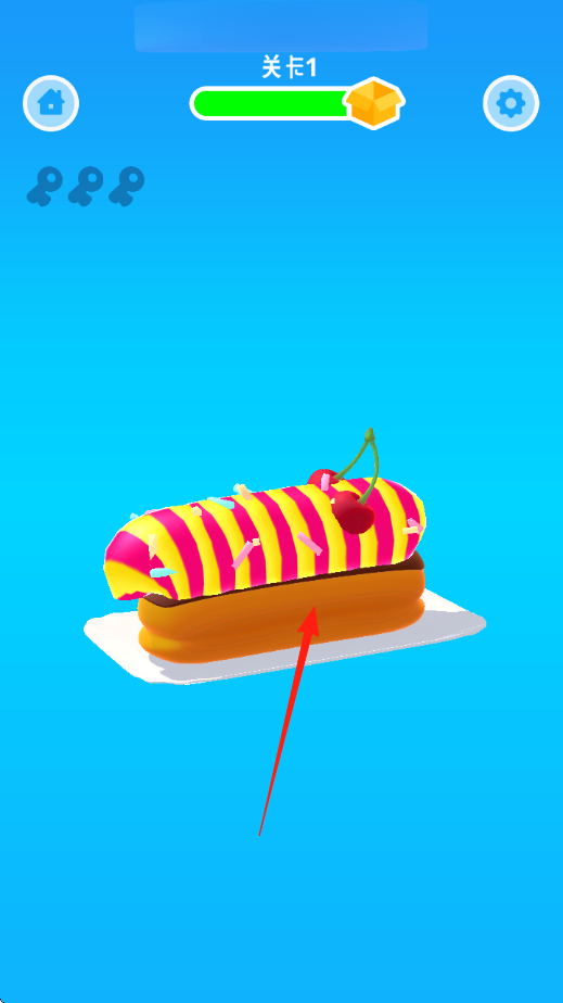 2、完成擠醬后,糕點(diǎn)會自動裝飾上櫻桃、糖屑,形成多彩外觀,系統(tǒng)判定符合要求,就能通過關(guān)卡1,解鎖新關(guān)卡。