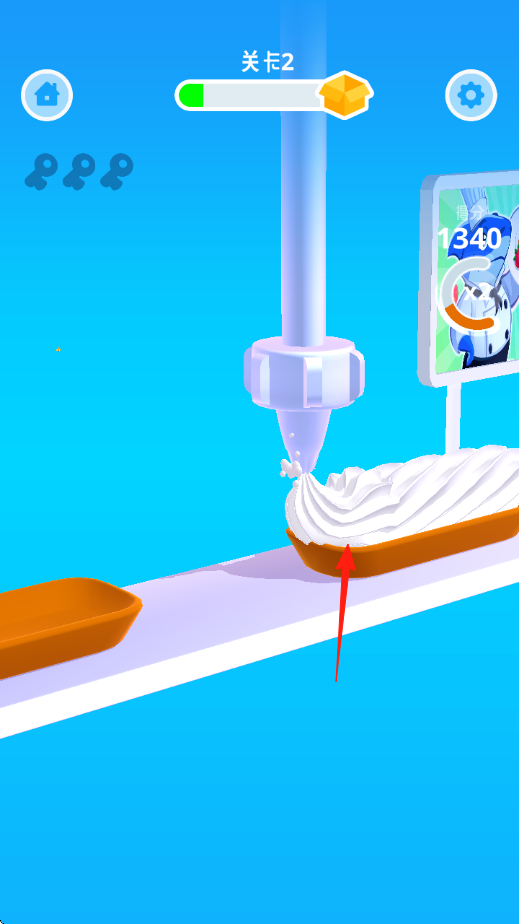 3、到關(guān)卡2,換了奶油擠醬工具,按箭頭指示位置,平穩(wěn)擠奶油,給糕點(diǎn)做奶油頂裝飾,開啟新制作挑戰(zhàn)。