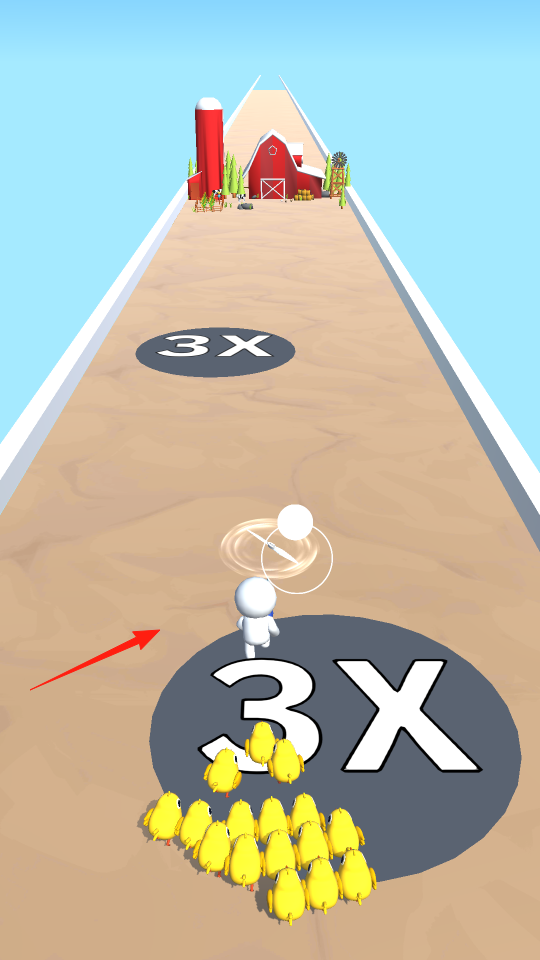 2、在救援跑道場景,操控白色角色移動,收集黃色小雞,角色踩中3X區(qū)域,小雞數(shù)量倍增,利用區(qū)域增益機制,快速擴充救援動物數(shù)量,讓角色在跑道上持續(xù)收集。