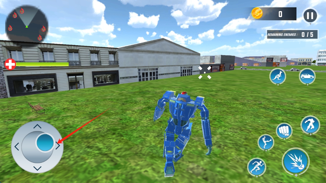 3、戰(zhàn)斗時,操控?fù)u桿移動機(jī)甲,點擊技能按鈕釋放攻擊,消滅敵人,完成關(guān)卡,撥動輪盤移動人物。