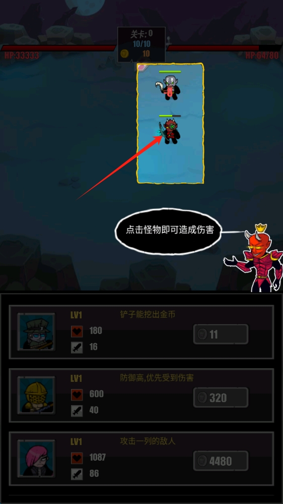 1、進入關卡,點擊怪物,利用英雄攻擊,積累金幣,注意怪物血量與己方英雄生存,點擊攻擊敵人。