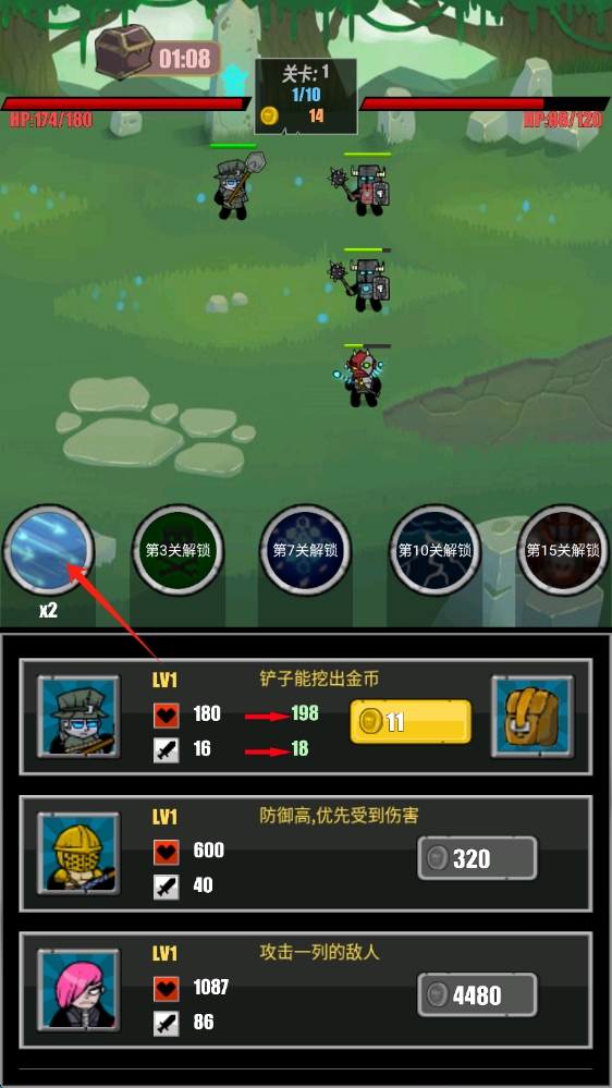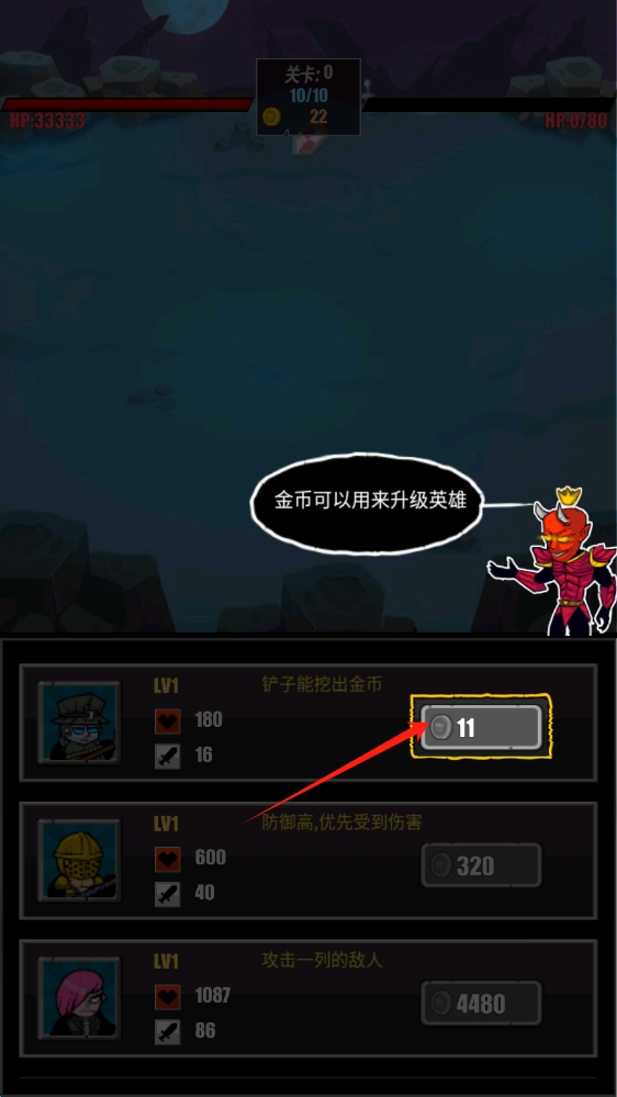 2、戰(zhàn)斗結束,用獲得金幣升級英雄,優(yōu)先提升輸出或防御關鍵英雄,增強戰(zhàn)力,點擊升級英雄。