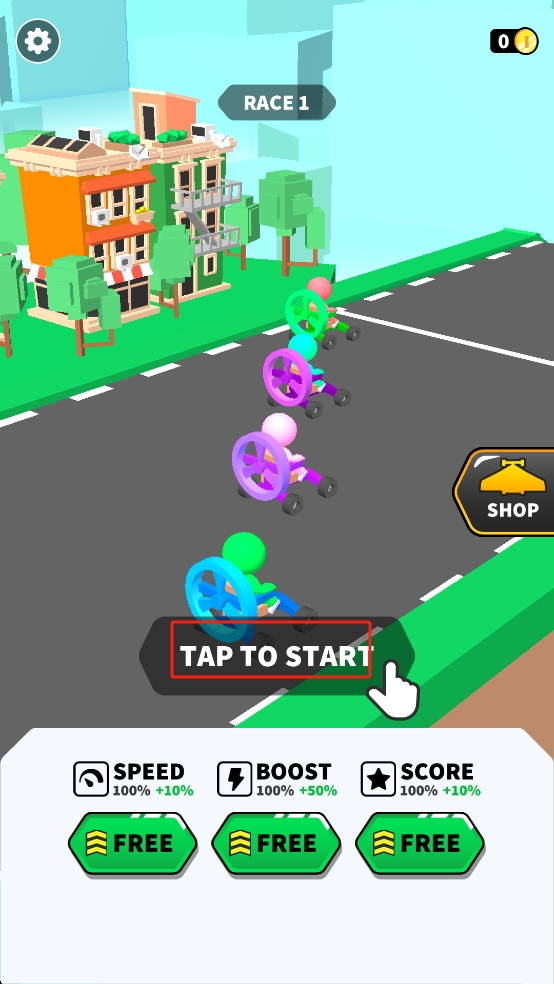 1、開局前可以先在下方升級(jí)一下各項(xiàng)屬性,任何點(diǎn)擊圖中標(biāo)注的按鈕,即可開啟激烈的比賽。