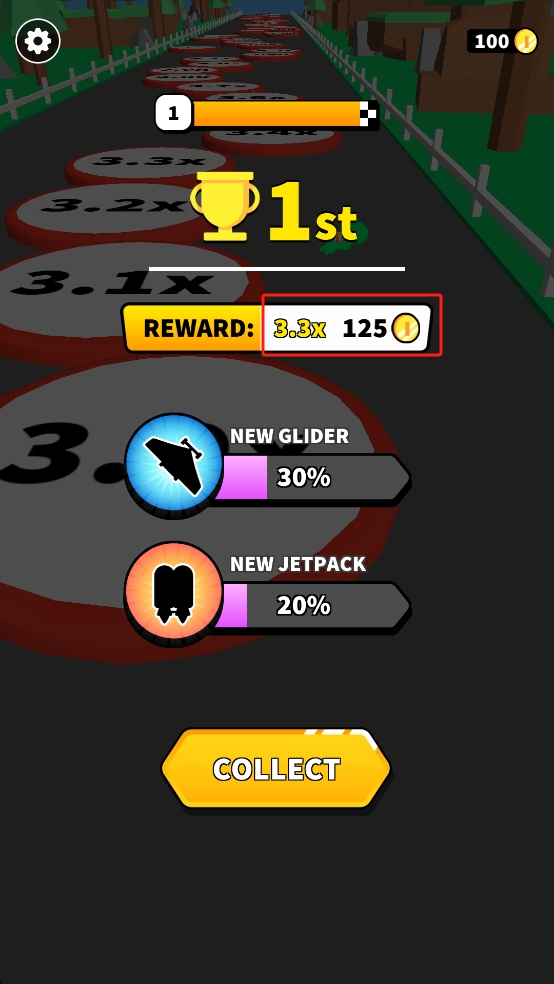 3、順利闖過所有關(guān)卡后,滑翔機(jī)會(huì)平穩(wěn)降落在終點(diǎn)平臺(tái),屏幕將顯示本次飛行的距離與得分,還能獲得金幣等獎(jiǎng)勵(lì)。