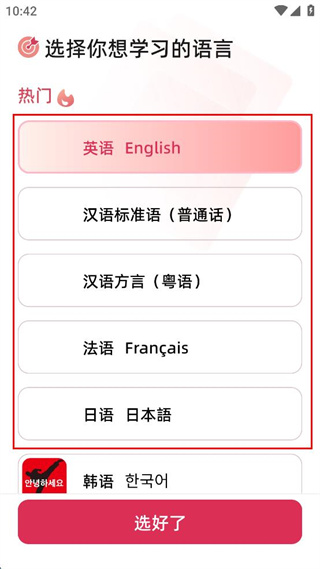 4、登錄后進(jìn)入語言選擇頁面,挑選想要學(xué)習(xí)的語言,再點(diǎn)擊“選好了”按鈕確認(rèn)。