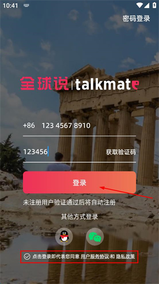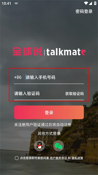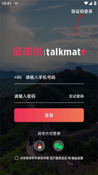 1、在全球說登錄界面,點(diǎn)擊右上角“驗(yàn)證碼登錄”選項(xiàng),切換至驗(yàn)證碼登錄頁面。