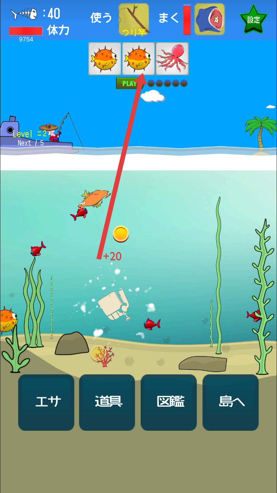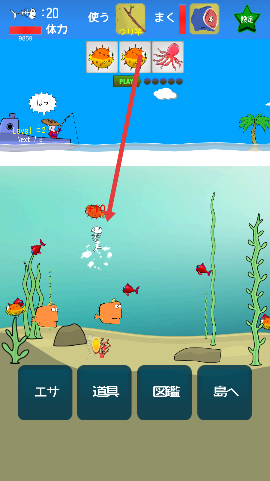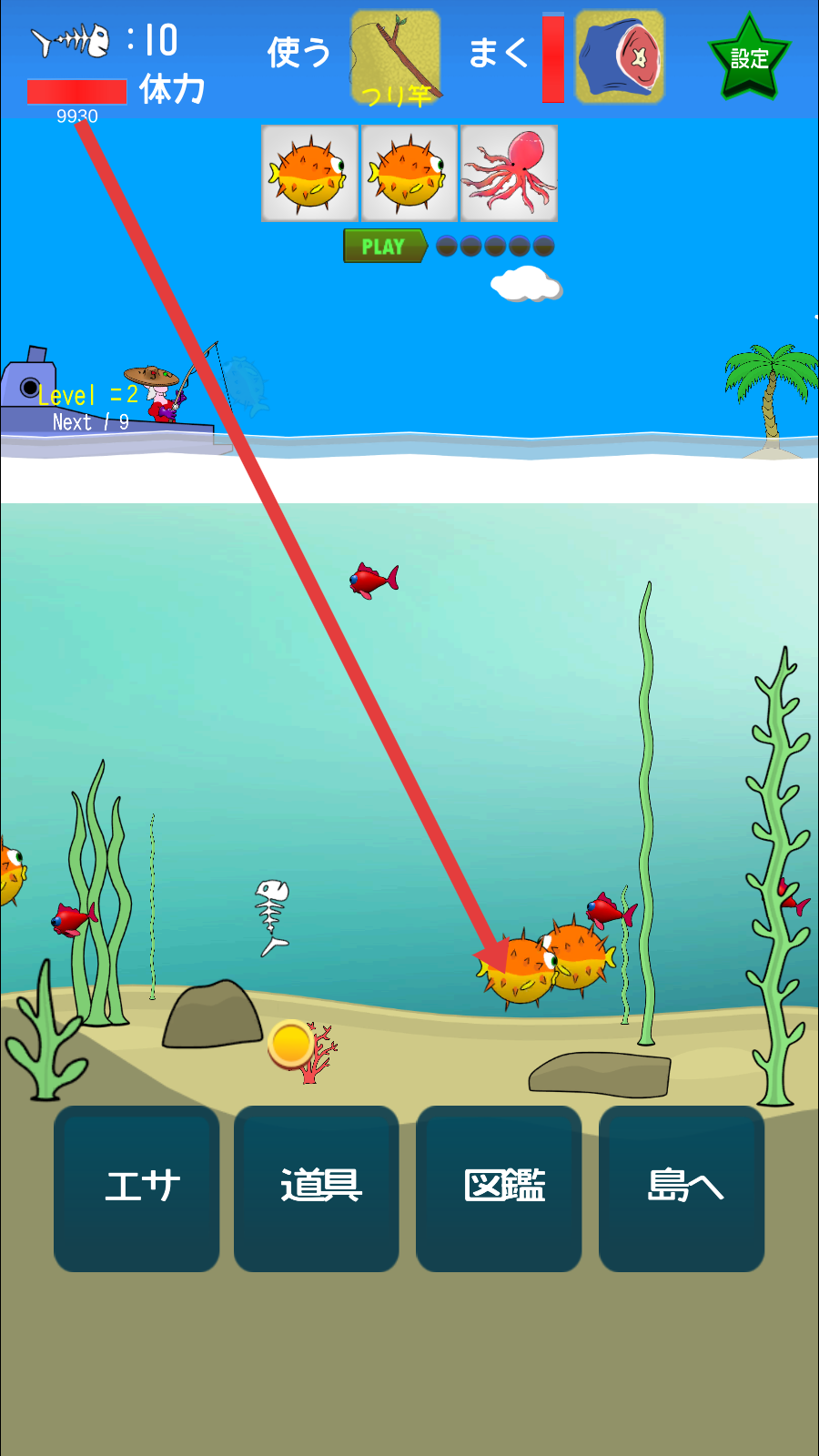 1、點(diǎn)擊エサ選魚(yú)餌,結(jié)合上方魚(yú)類(lèi)圖鑒,選釣河豚等適配餌,點(diǎn)PLAY開(kāi)始釣魚(yú)。