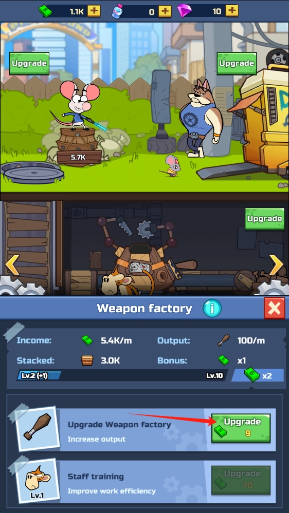 3、在武器工廠界面,點擊Upgrade,升級武器工廠,提升生產(chǎn)效率,增強實力,點擊升級道具。